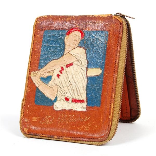Vintage leather Ted Williams men's wallet. Made by Congress, it is genuine saddle leather. The outside features a color illustration of the "Splendid Splinter" swinging the bat. It is 4 1/2" x 3" and shows considerable use. Dates to the 1950's.