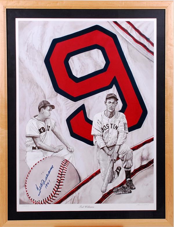This striking lithograph celebrates the "Splendid Splinter", Boston Red Sox legend Ted Williams. He is depicted here on a background that resembles the back of his uniform with a large #9. The lithograph measures 23 x 31.5" and is signed and numbered (290/521) by artist Lewis Walkins. Ted Williams has signed the litho in mint blue Sharpie with the inscription "1941": the season his batting average was an astronomical .406. Framed and matted to 28.5 x 37".