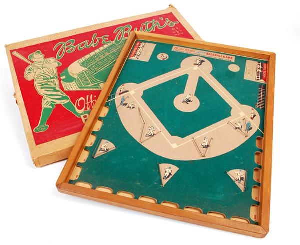 Wonderful vintage baseball game comes with its original box. Babe Ruth's Official Baseball Game, manufactured by Toy Town Corporation of NY, NY, features a baseball diamond playing surface in a wood frame. The attractively screen-printed cover has Ruth at the plate alongside Yankee Stadium. It appears that a batter and other pieces of the game are missing. Also, the cardboard backing is loose (but easily repaired.) Regardless, the game and box look great. The original box measures 19.5 x 25.5 " and the game, slightly smaller. The box shows a bit of wear and tear, but is overall VG and still sturdy.