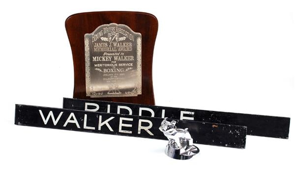 The Bulldog from North Jersey was something of a renaissance man: a world champion boxer, painter and restaurateur. Here is a great lot of (4) items from Mickey Walker's collection of boxing mementos. They include: a fitting, 5" chrome Mack bulldog statue engraved with his name (MT); (2) 2.5" x 30" metal fight signs, painted black with "Walker" & "Riddle" (EX); a gorgeous 1965 presentation plaque awarded to Walker by the Boxing Writers Assoc. with an ornate sterling silver engraved plate on a wood back (NM).