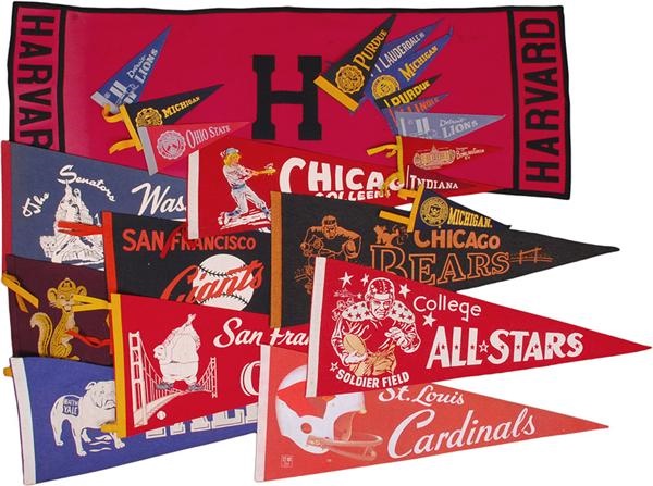 Great collection of sports pennants. Vintage and modern, more than (50) in total. Includes several 1950's New York Yankees "World Champions" pennants, one with a photo of the team including Berra, Howard, Mantle and Maris. Also includes the following pennants: Vintage 1959 Chicago White Sox "AL Champs"; Vintage Washington Senators; 1971 Detroit Tigers; 1950's Chicago Bears; 1967 NY Jets; Vintage Cornell; Vintage Harvard and Princeton; Vintage St. Louis Cardinals among many others.