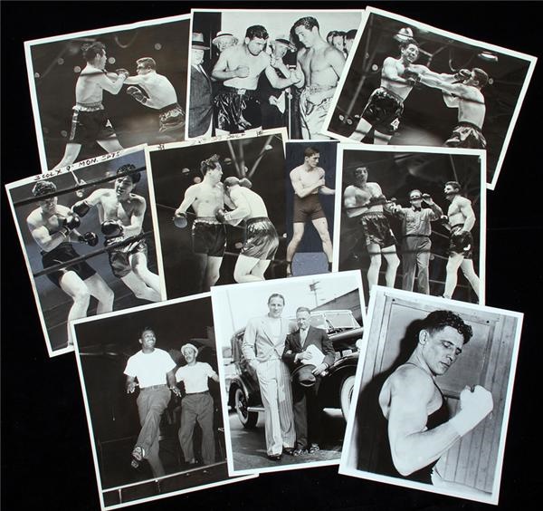 In 1939 Max Baer and Lou Nova fought to meet Joe Louis in the heavyweight title fight. The legendary Baer made it eleven rounds before the ref called a TKO and declared Nova the winner. These stunning images tell the story. Two images from their rematch in 1941 are also included, as well a hilarious gag pose after weight in, fine portrait, reading a magazine and more. Many of the photos have their original caption sheets attached to the verso. The condition of the lot ranges from VG to MT, with most NM/MT. Sized from 3x8" to 8x10".