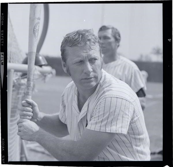 Original 2 1/4" negative of Yankee slugger Mickey Mantle. Image is a close up of him taking batting practice. Dates to the 1960's.