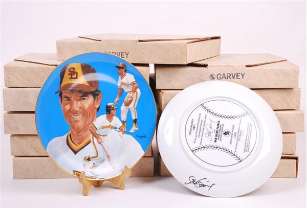 The image of Golden Glove first baseman, Steve Garvey, graces these (11) collectors plates made by Hackett American Collectors Co. in 1983. The 10", gilt edge plates show Garvey as a Padre. On the back is the artist information as well as the limited edition (of 10,000) numbers. Garvey has signed these plates on the back edge in mint black Sharpie. All plates are in new condition and in their original packaging.