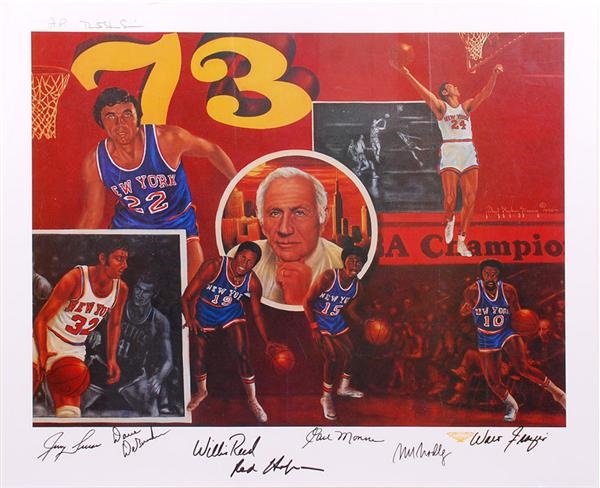 24 x 28'' print lithograph signed by seven players including Jerry Lucas, Willis Reed, Walt Frazier, Earl Monroe, Red Holtzman, Dave Debusschere and Bill Bradley. Limited edition is an Artist Proof. LOA.