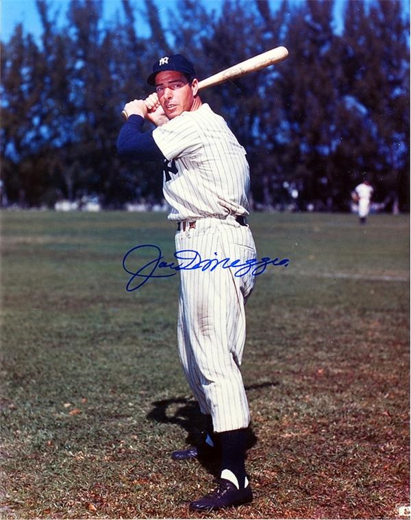 One lot of three signed photographs. Includes 16 x 20 of DiMaggio in batting pose and two 8 x 10's personalized "To Pete." All are signed in blue sharpie. EX-MT.
