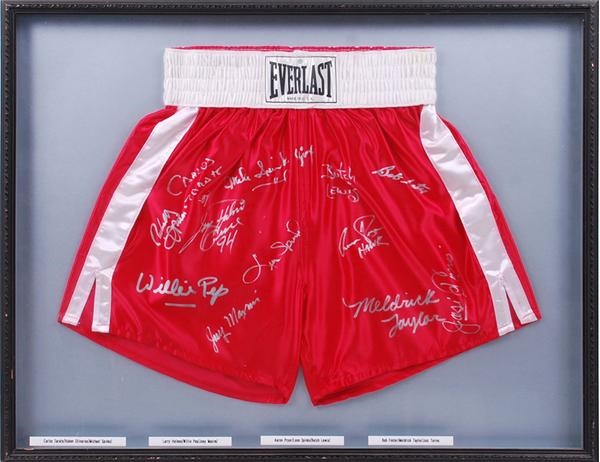 Red satin, Everlast boxing trunks adorned with the signatures of (12) boxing greats. The HOF signatures in silver paint pen include: Carlos Zarate, Ruben Olivaries, Michael Spinks, Larry Holmes, Willy Pep, Joey Maxim, Aaron Pryor, Leon Spinks, Butch Lewis, Bob Foster, Meldrick Taylor and Josi Torres. Framed to 24 x 31".