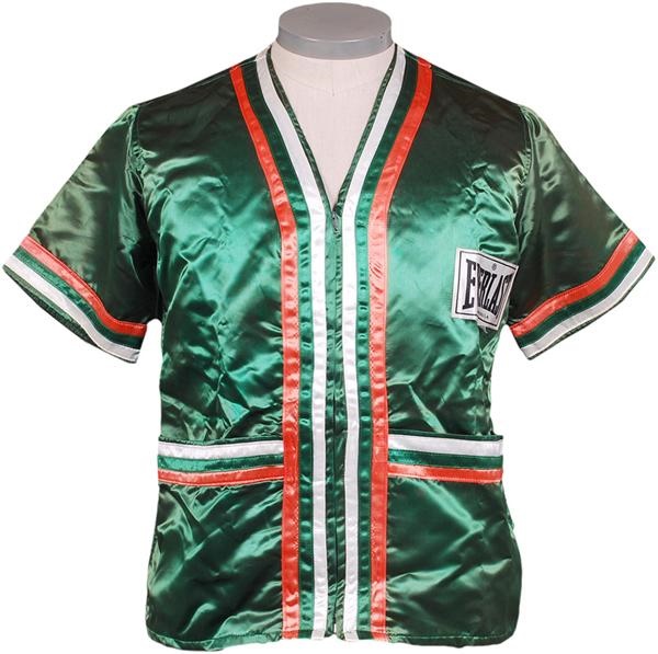 Green nylon satin front zip short sleeve jacket with white and orange striping down front zipper and around sleeves and pockets. Everlast patch sewn on front left breast of jacket with size small tag sewn below. On back, white circular patch measuring twelve inches across, "Cooney" with a green shamrock and a horseshoe shape below it. Overall in very good condition.