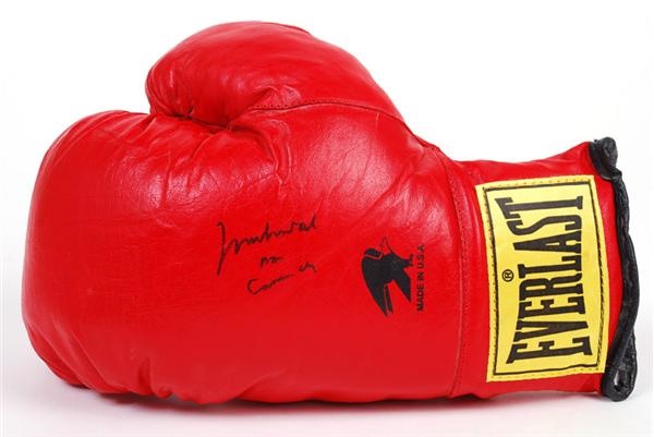 Red "Everlast" left hand boxing glove signed by Muhammad Ali. Signature reads "Muhammad Ali aka Cassius Clay" in mint black Sharpie. "14" is stamped in gold on the inside of the palm. Glove is in near mint condition.