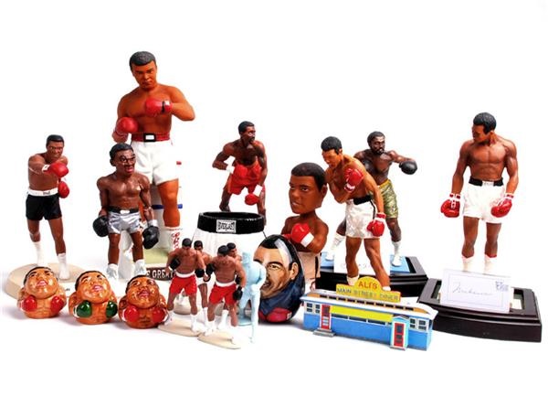 Twenty collectible porcelain figurines from the Muhammad Ali dynasty. Three pieces are signed, the rest are not. Signed pieces include: Salvino "The Greatest" figurine and two placards (one signed by Ali and the other signed by Joe Frazier). Other items include: Ali Kenner poseable plastic figures, Ali decanter, porcelain Ali trunks, Ali's Main Street Diner, Ali musical egg, small face pots, Tommy Hearns figurine, Joe Frasier figurine (clean break at knee) and an Ali nodder. Sizes range from 3" to 15" and many are of a limited edition. A few of the lesser pieces are broken, but the better ones are nice. Otherwise conditions range from VG to Mint with most being NRMT. Outstanding collection.