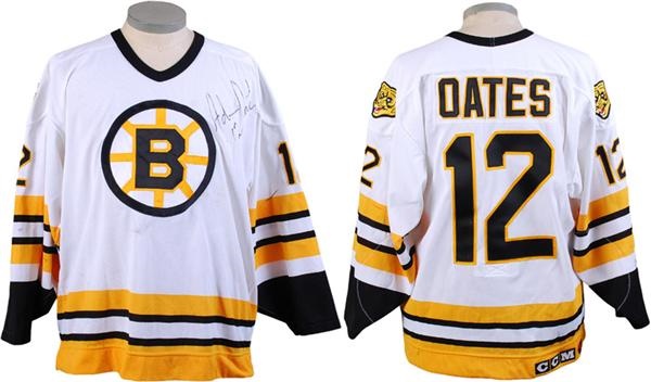 Home white jersey has 2nd Set 1991-92 Season stamp inside hem at bottom. Also, Oates has written inside the bottom hem, "My game jersey 91/92" and initialed "A.O." Signed on the chest by Oates also. Fight strap cut out. Fine use with stick marks, a rip, burns, and pilling inside. NHL 75th patch removed from the breast.