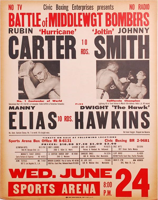 Successful middleweight boxer, Rubin "Hurricane" Carter, was jailed for a murder he did not commit. His plight was brought to the world's attention by a Bob Dylan song and a feature film. Here is a site poster advertising a bout against Johnny Smith at the LA Sports Arena June 24, 1964, before his tragic downfall. The 22.5 x 28" poster is in incredible condition with only minor toning around the outside edges. Super photos of both contenders and classic fight poster graphics.