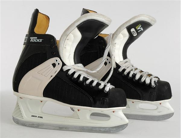 1990's CCM Tacks VT652's are custom for Mario and are size 11.5. Both have his "66" written on the bottoms in black marker. Moderate use.
