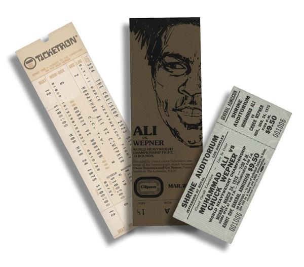 (3) full tickets from the March 24, 1975 World Heavyweight bout showcasing Ali vs Chuck Wepner. Includes (2) onsite tickets (one is a Ticketron) and a closed circuit ticket for the Shrine auditorium in LA. All are NM-mint.