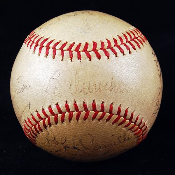 Official National League Frick Baseball signed by 17 members of the 1942 team. Includes Pee Wee Reese, Billy Herman, Dolph Camilli, Mickey Owens, Joe Medwick, Pete Reiser, Augie Galan and more. The Leo Durocher signature is secretarial. Signatures are 5/6 on scale of 1-10.