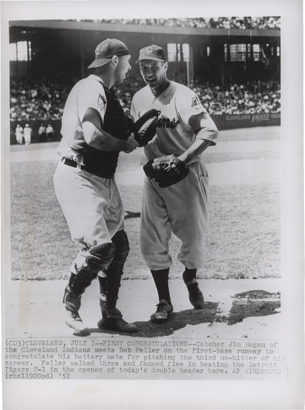 Super collection if Jim Hegan baseball wire photos (12). Hegan was catcher for the Cleveland Indians from 1941-1957 including two World Series appearances in 1948 and 1954. Photos range from 8" x 8 1/2" to 8 1/2" x 11". Conditions range from EX-NRMT. One depicts Hegan congratulating Indian great Bob Feller immediately after he pitched the third no-hitter of his career versus Detroit in 1951. Another shows him after being "knocked out" after a foul tip by Boston's Dom DiMaggio in 1947. There are also some neat father son shots of Jim with his future major league All-Star son Mike, including one when they are both in uniform as player and coach for the NY Yankees in 1962.