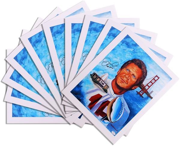 (20) Beautiful lithographs celebrating Pro Football Hall of Famer, Joe Montana, featuring art by Gerald Roberts and signed by Montana with the inscription "HOF 2000". The identical 16 x 20 lithographs, from Portraits Guild Limited, Inc., each comes with their own COA and authentication sticker from JSA. Mint.