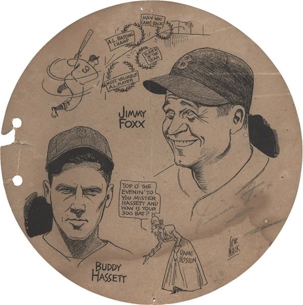 The Boston Baseball Writers Association recognized Jimmie Foxx as the outstanding Red Sox player of the 1938 season. This is a program cover from the awards dinner in 1939, featuring an illustration of Jimmie Foxx by the legendary Gene Mack. It is signed by Foxx in 7/8 pencil. The cardboard of the cover is torn and missing a small (1/2" square) chip where it was originally bound. There also 5 small tack holes around the perimeter and a moisture spot along the bottom edge. However, the images are super and signature clear. Comes with an LOA from JSA.