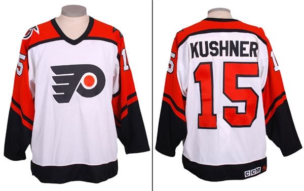 Home white jersey is all original with name sewn on a plate on the back. NHL 75th Anniversary patch on right shoulder while the Flyers 25th Anniversary patch is on the left shoulder. Moderate use with some burns and stick marks. Light pilling inside. Maska and size 50 tagging in the collar.