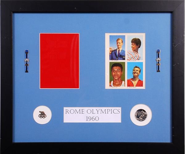 17 x 20.5" framed display with Muhammad Ali / Cassius Clay rookie card on the original uncut panel of four cards (also includes Wilma Rudolph, John Ljunggren and Harold Nielson), original folder issued with the card, Olympic pins (3) and coin. The Ali card has a couple of small wrinkles, but no tears. Frame has some light scratches and dings. Impressive looking display