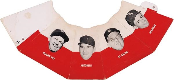 This was folded up and a ball set on top of it for display in sporting goods stores. The faces included on the box are Nelson Fox, Antonelli, Al Kaline and Aparicio. Two toned with white on top and red on bottom. White areas slightly toned due to use and age. Overall in very good condition.