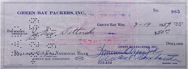 Official Green Bay Packers Check signed by Vince Lombardi in mint blue ballpoint. Dated 9-19-1959. NM-MT.