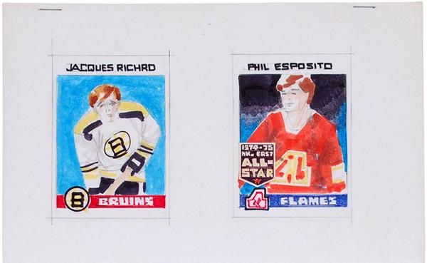 This unique 1973 Topps Hockey card original prototype artwork is an exciting piece of sports themed artwork. The illustrations are prototypes of cards for Bruins player Jacques Richard (mis-spelled on card as “Richrd”) and Flames player Phil Esposito. The players did not play for those teams but the Topps artist was obviously more interested in being creative than being accurate. The colors are bright and the drawings which are 2.5”x3” are in excellent condition.