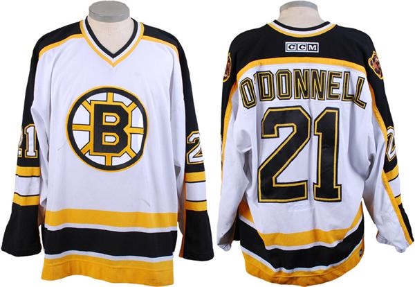 All original home jersey has name sewn on a plate on the back. Number 21 on the back and both sleeves. "Made In Canada" size 56 tagging in the collar with the CCM logo sewn on the back of the neck. Nice use with stick marks, team repairs and pilling inside. Set 1 stamp inside on the crest. Also, signed inside by the Equipment Manager. Comes with a Bruins LOA.
