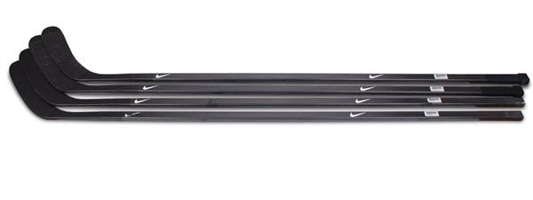 Experimental Nike sticks are all the same. One piece fiberglass with "LEMIEUX" stamped on the shaft of each one. Two have the original tape on the blades and the butt ends and were tested by Mario in practice. Two are not taped and were never used. Total of four sticks.