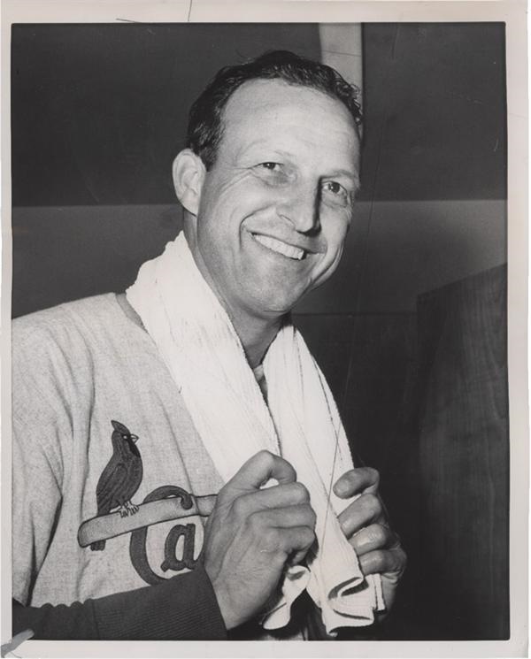 This huge collection of wire photos features a variety of game action shots of the HOFer Stan Musial as well as a variety of publicity shots, many of which are family photographs. There are several game action photos as well as a large number of images date from after the legendary player’s playing career when he served as President Johnson’s Director of the Physical Fitness Program, Cardinal’s management team, a restaurateur and businessman. The photos range in size from 5 x 8” to 8 x 11.5” and the quality varies from G to EX with some wrinkling and creasing and minor age discoloration. This is a great lot that gives Musial fans an entirely different perspective on this legendary player and his life during and after his incredible baseball career.