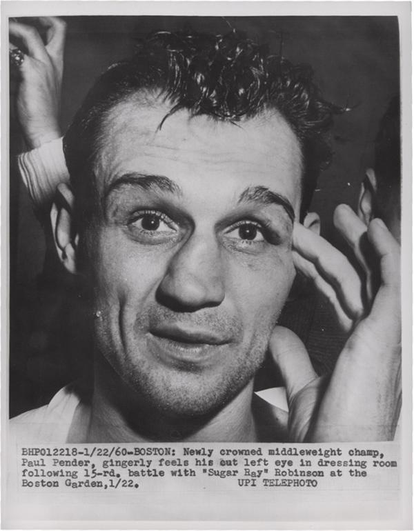 This is a huge collection of images from the height of the prizefighters' career. A large number of the photos chronicle the lead up to and the actual 1961 middleweight title fight against London fighter Terry Downes where Pender successfully defended his title. There are also several publicity shots of Pender and his family as well as the April 1961 fight with Carmen Basillo. Photographs range in size from 4 x 10" to 8.5 x 12" and the quality grades from G to VG with some wrinkling and creasing and a fair amount of editorial markings since the collection is of news wire photos, many of which have the original news clippings attached to the verso.