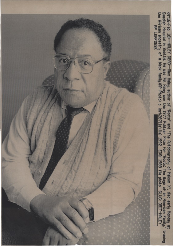 Author Alex Haley is known as being the writer of Roots. What you may not have known is that he was also a writer for Playboy Magazine and he conducted the magazine’s first interview ever for the September, 1962 issue. The interview was with Miles Davis. He followed the Davis Playboy interview with others including Dr. Martin Luther King, Jr., Cassius Clay, Johnny Carson and Sammy Davis, Jr. This collection of San Francisco Examiner and news service photos (24) chronicles his life and career during the Roots phenomenon and includes mostly laser photos in the 8" x 10" size range. The Conditions are mostly from GD-VG. There is a great shot of Haley with the cast of Roots including Ed Asner, Lorne Greene, Lloyd Bridges and Levar Burton. There is also a shot of Haley in front of his boyhood home in Henning, TN; and one of him on his boyhood home's front porch, where he once sat with his grandmother as a youth while she first told him stories of their family.