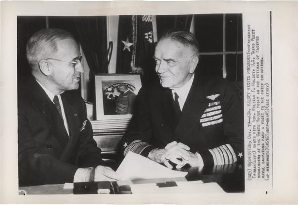 William Frederick "Bull" Halsey, Jr., was a U.S. naval officer and the commander of the U.S. Third Fleet during WWII in the Pacific theater against the Japanese. This collection of news service photos (93) chronicles his storied life and military career. Included are pictures of the "Bull" as a baby, a young man, with his family, with Mayor Fiorello LaGuardia, Jack Benny, and President Truman. Sizes are mostly in the 8" x 10" range and conditions average VG-EX many with newspaper edit markings and caption sheets taped to the verso.