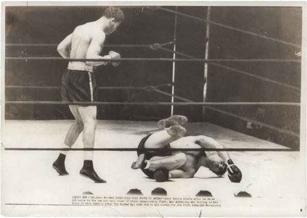 The second bout between Joe Louis and Maz Schmeling is featured in these three oversized AP wire photos. Two depict the German down on the canvas, the other shot earlier in the first round shows the two boxing legends sparring. Although Schemeling won the first bout, this rematch was decided in round one with Louis winning by KO. The prints are (2) @ 11" x 14, (1) @ 12" x 17". Condition averages VG with some creases and small tears as well as newspaper edit enhancements.