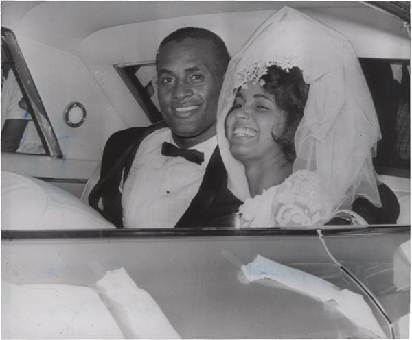 The newly minted Mr. and Mrs. Clemente couldn't be happier in this post nuptial photo from 1964. The 6.5 x 8" photo is in EX condition.