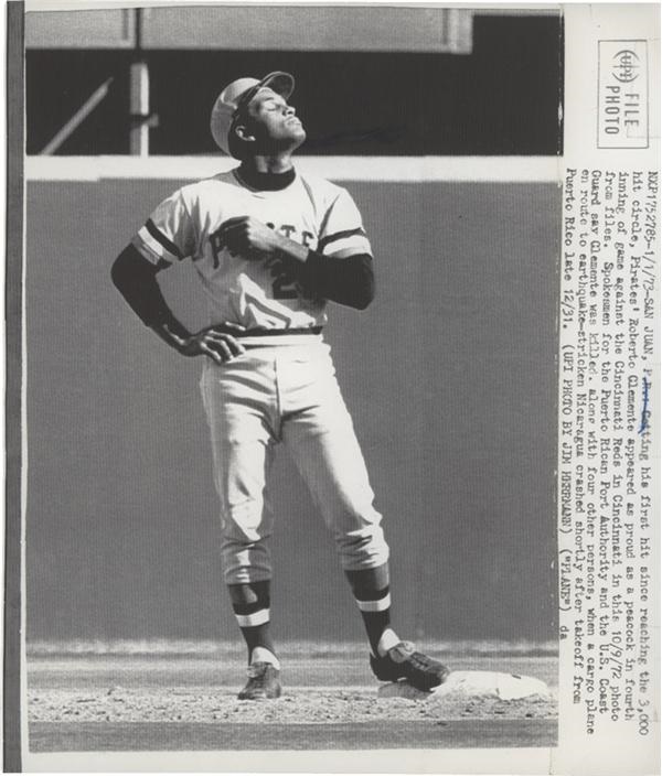 Bittersweet, front-caption wire photo. The UPI image shows Clemente, sun on his face, after his first post-3000 hit. The caption tells the tragic news of his death in a plane crash, on his way to help earthquake victims in Nicaragua. There is a crease at the edge of the caption, but it does not interfere with the photo. Measuring 8.5 x 10, the photo is in EX condition.