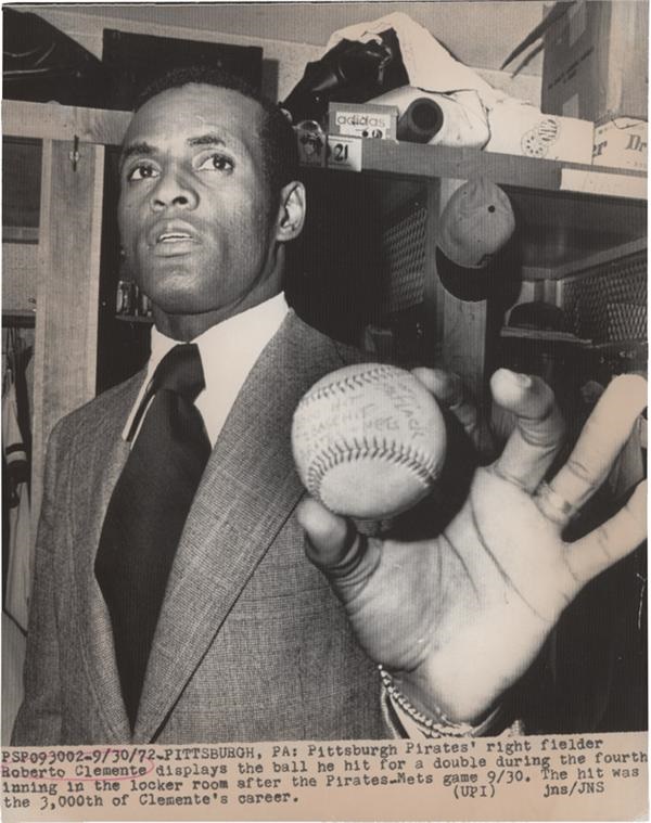 Lot # 316: Roberto Clemente holding 3000th Hit Baseball (1972) pirates right fielder