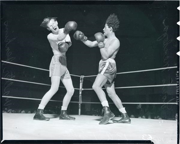 Photo journalists of the San Francisco Examiner compiled this group of vintage 4x5" boxing negatives. The earliest, from the 1920's, are glass plates with the images of fighters Babe Herman, Jose Santa, Pinto De Sa and Joe Lang. Also includes fantastic fight images (originals) of Max Baer vs Al Rovay and Fred Apostoli vs Tom Sparr in '37. Many nice negative images of SF area amateur prizefighting in the 1940's as well. Overall in fine condition.