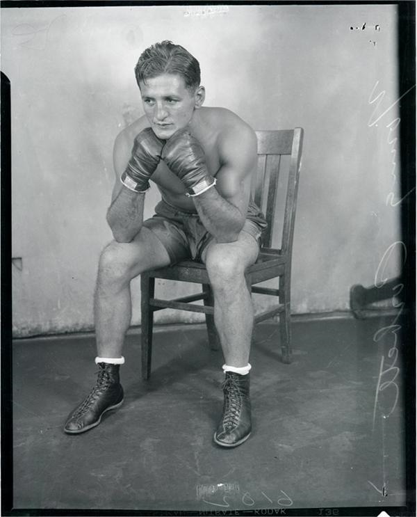 A collection of 4 x 5" negatives capturing a variety of images from early in Jim Corbett's career. There are several images of the young boxer training, several in-fight shots of bouts with challengers like Billy Conn and Terry Sorap. There are also publicity images and scenes from the prizefighters personal life. The quality of the 1930's negatives are excellent. A terrific lot for Jim Corbett fans out there.