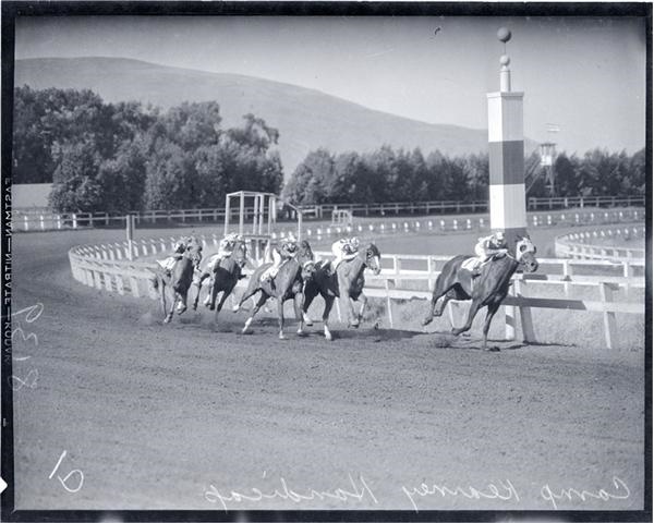 This is a great collection of 4 x 5" negatives, some glass, dating from 1931- 1937 featuring traditional horseracing, several collections from the Bay area Tanaforan racecourse. There are also a few collections featuring harness racing, some from a track in Golden Gate Park. The entire collection of negatives is from the San Francisco Examiner archives. The negatives are in excellent condition and it is a prime lot for fans of early horse racing.
