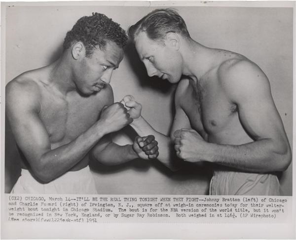 This is an amazing collection of 7 x 9" and 8 x 10" news wire photos featuring prizefighter Charley Fusari. The majority of the images are fight action photos from bouts with Sugar Ray Robinson, Terry Young, Rocky Castellani, Vince Foster, and Johnny Bratton, though there are also some publicity shots. The photos range in quality from VG to EX , some with minor creasing. What is great about this lot are the in-ring fight compositions that capture the brutal energy inherent in boxing matches.