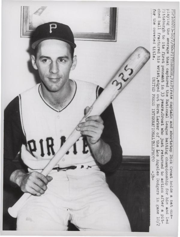 This collection of photographs captures in-game and publicity shots from the legendary short stop's career. There are photos from Groat's tenure with the Pirates as well as with the Cardinals. The photos range in size from 2 x 4" to 8 x 10" with the majority being on the larger size. They are primarily news wire photos, some with the original news clippings attached to the verso. The quality ranges from VG to EX with very minimal creasing or age discoloration, some have a fair amount of editorial markings.