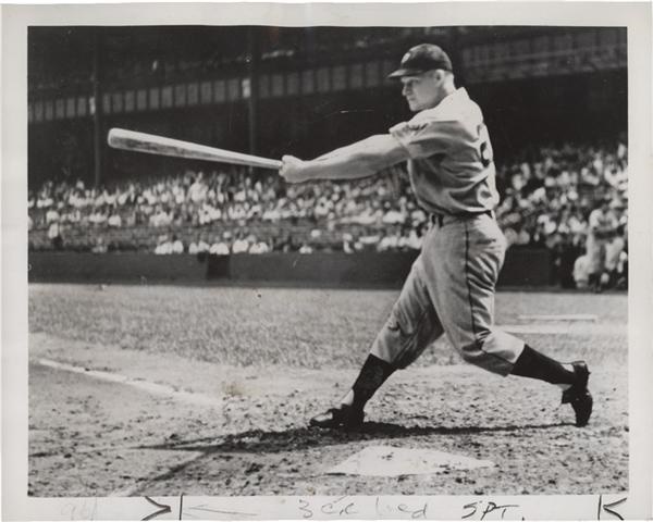 This is a huge lot of photos from the San Francisco Examiner sports photo archives. The collection of news wire photos range in size from 2.5 x 2.5" to 8 x 10" with the majority of images being either 7 x 9" or 8 x 10". Many of the wire photos also have the original news clippings attached to the verso. The collection features game action photos, publicity shots and several locker room shots capturing a vast number of the era's baseball greats in candid moments. Featured players are Barney McKosky, Mickey Haefner, Ernie Fazio, Rob Gardner, Greg Goosen and infamous Mets manager Casey Stengel. The photos in the collection vary from G/VG to EX in quality with some editorial markings and only very minor creasing.