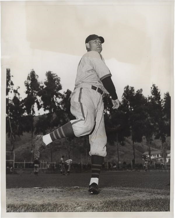 The Chicago Cub's pitcher from 1926-1941, he may be best known as the pitcher of that famous throw Babe Ruth predicted he would hit into the stands at Wrigley Field during the 1932 World Series. The images vary from in field action shots to publicity family shots. The images range in size from 3 x 7" to 8 x 11". The photos date from the 1920's to the 1970's with the majority of the images dating from the 1930's. The quality ranges from G to VG with some minor tears, wrinkles and age discoloration.