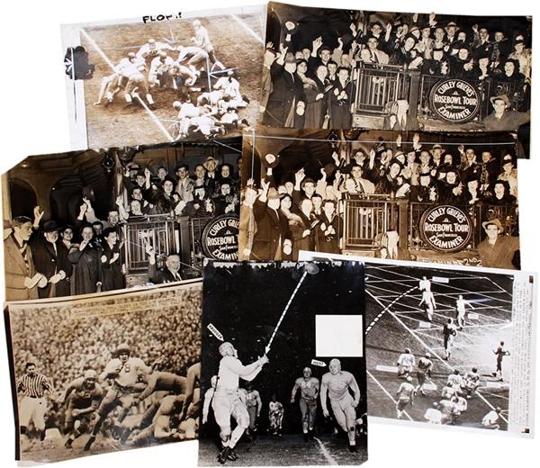 USC and Tennessee battled it out in the 1940 Rose Bowl game. USC held the volunteers scoreless in their 12 point victory. This collection of (8) wire photos captures the action with many images diagrammed and in-painted by editors. Great fan shots, too, with photos of the annual SF Examiner train to Pasadena. Measure 5 ? x 11" to 9x14" and range in condition from G to EX.