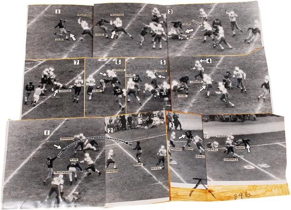Ohio State beat Cal in the 1950 playing of the Rose Bowl in Pasadena. This collection of (14) wire photos captures the action and the key Ohio State play that secured their victory. All of the photos have been diagramed and in-painted by editors and five are multi-panel creations illustrating important play action. Size ranges from 9x11" to 6x24". VG overall with some worse, some better.