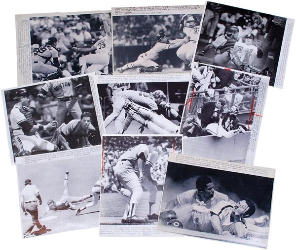 Gargantuan lot of (250+) baseball wire photos. From the 1970's and 80's, the group consists primarily of laser wire photos with front captions. Includes a series of base stealing/slide images from 1975, a beer night riot in Cleveland in 1974, the goat and grandson of Cubs "goat-hexer" with their NLCS tickets in '84, 1980's league and World Series championships, plays at the plate, many scuffles and tons and tons of game action. Fine condition overall with most measuring between 7 x10" & 9x 11" approx.