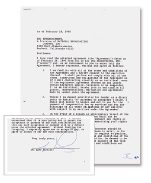 The actual NBC television contracts for the man who succeeded Johnny Carson. These are the ones that started the late night talk show wars with David Letterman and made famous in television annals by the book and film The Late Shift by Bill Carter. Though many are bound together, there are a total of twelve signed contracts here, varying from two to twenty pages in length. They are each signed in Mint ink. Jay has signed each of them. Helen Kushnick Leno's famous ousted manager has signed several of them as well, and Jay has signed some of them twice instead. Most are signed by NBC as well. One is initialed by Jay on all fifteen pages. Otherwise contracts are EX+. These contracts represent one of the most important annals in television history: The Late Show Wars.