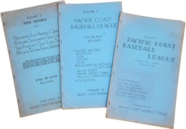 Three fascinating volumes of Pacific Coast League baseball records published in 1949. The volumes cover records set between 1903 and 1949. Volume 1 details club standings, batting records, pitching records, general team records, attendance records & stolen base records. Volume 2 breaks down fielding records as well as no-hit games, extra inning games, all-star line scores and PCL "oddities". Volume three contains the yearly club records of each of the PCL teams. The stapled bindings of all three books are solid and the covers, aside from some fading of the blue cardstock, are in great condition: VG to EX overall.