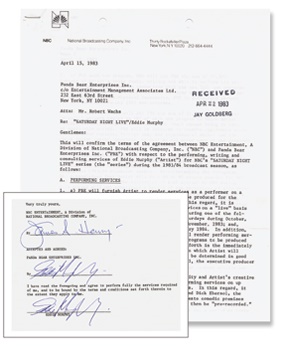 Original 1983 television contract from one of the true groundbreaking shows and where he got his start. Three-pager is Mint signed twice by Murphy & NBC. Otherwise EX+.